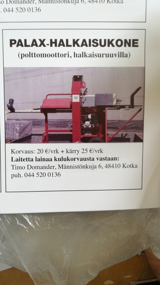Klapikone polttomoottorikäyttöinen sirkkeli katkoo tukit ja ruuvi halkaisijalla teet suoraan pinottavat polttopuut. PALAX.in halkaisuruuvi yhdistelmä poikkisahaus-sirkkelillä. Itse voi tehdä määrä mittaisia klapeja tukista. Lainaus on 20€/pv + peräkärrin kanssa 25€/pv